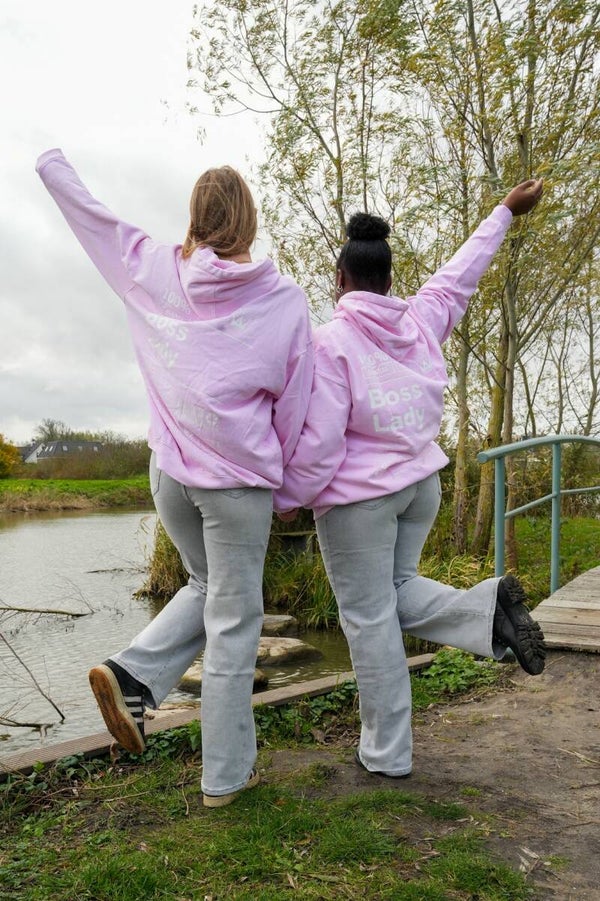 De Noor hoodie is een roze hoodie met een echte Bosslady attitude. Op de voorkant staat de tekst Bosslady en op de achterkant een grotere print met krachtige quotes, perfect voor vrouwen die weten wat ze willen. De hoodie heeft een heerlijk zachte binnenkant en een écht oversized fit voor een comfy, maar zelfverzekerde look.