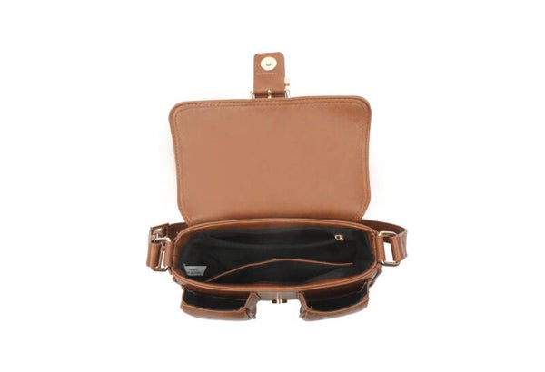 Deze schoudertas heeft een retro look geïnspireerd op de jaren ’60 en ’70. De gouden gesp geeft een moderne touch en sluit dankzij de magneet gemakkelijk en veilig. De tas biedt voldoende opbergruimte met 2 binnenvakken en 2 buitenvakken, zodat je je essentials netjes kunt organiseren.