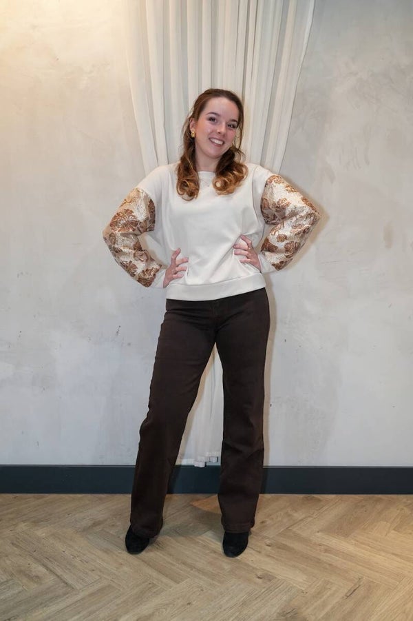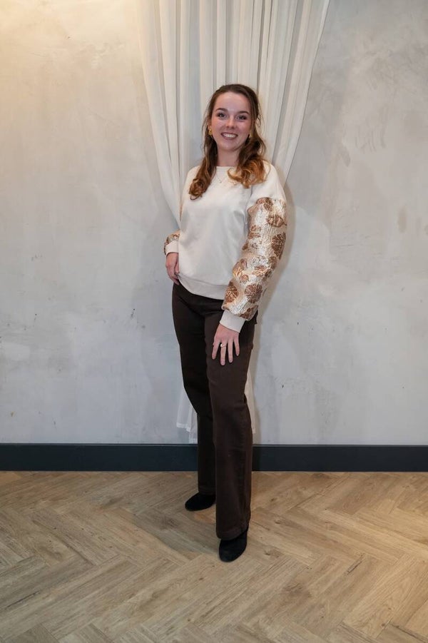De Nikkie Trui is een zachte, comfortabele trui met een relaxte pasvorm. De mouwen zijn versierd met een subtiel bruin patroon, wat een stijlvolle, speelse touch geeft. Perfect om in weg te kruipen op koude dagen, zonder aan stijl in te leveren.